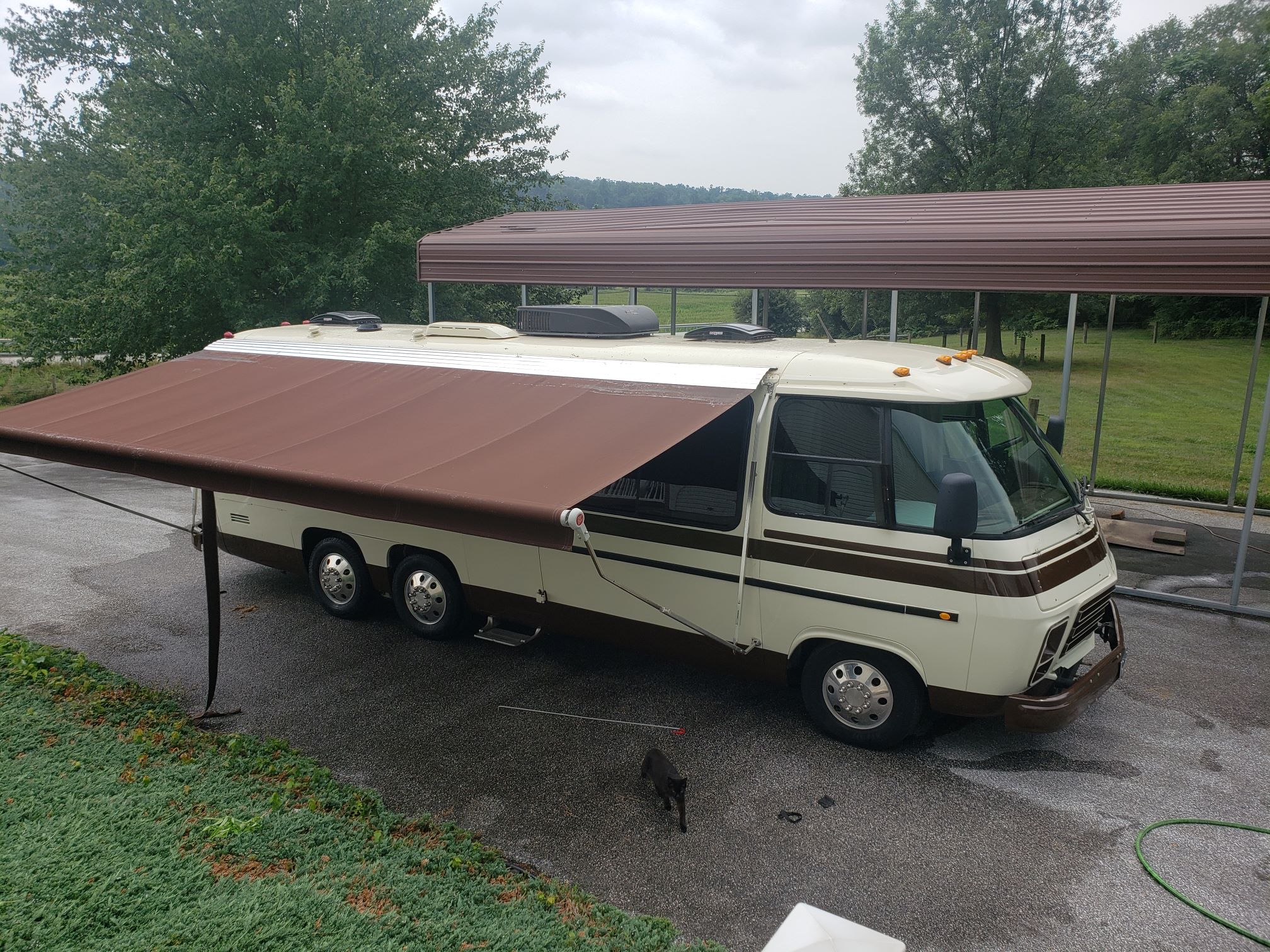 • Two A&E Dometic awnings with cloth – color matched blue (one 8’x20’, one 2’x14’), Custom made brace for main awning to protect from front door,