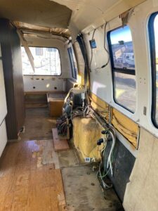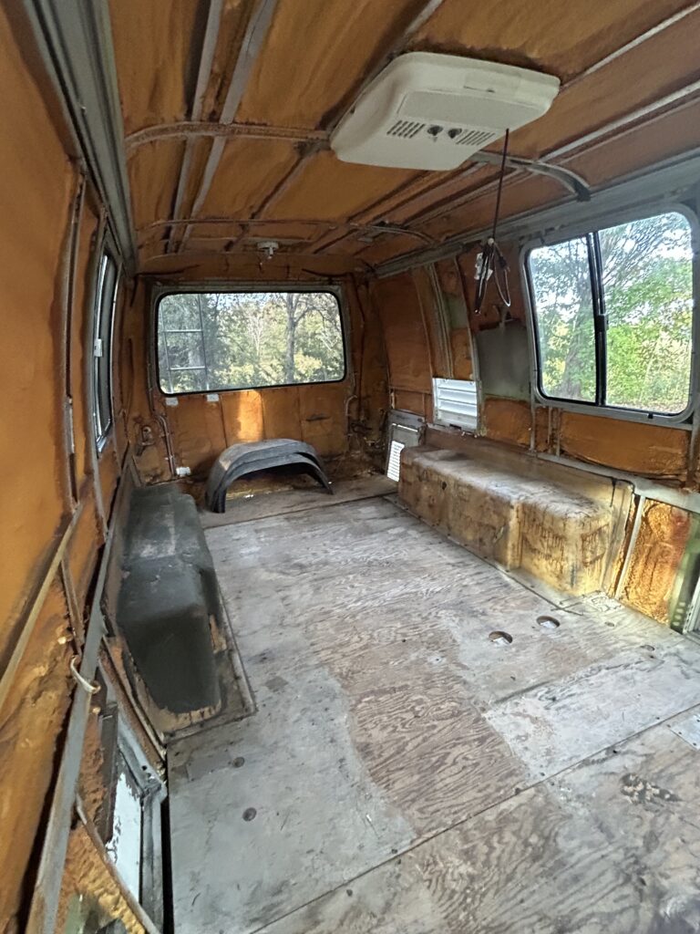 Interior was mostly removed in preparation for restoration (bathroom and refrigerator remain). During a recent startup, an engine compartment fire occurred and was extinguished within 10–15 minutes, but it melted plastic components under the hood.