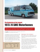 41973 Glacier owned by Sandi Renk | Burnsville, Minnesota.The Beginning of the Legend1973-74 GMC MotorhomesThe first two years of production are the most difficult models to identify since there is little information on the coaches, only clues. We would like to share them with you.BY BILL BRYANT | GMC MOTORHOME HISTORIAN | 1976 PALM BEACH | PLEASANT VALLEY, NY AND JANET FREY | 1976 PALM BEACH | MILFORD SQUARE, PAOver the years, many of us have read about the history of the GMC, especially Bill Bryant’s detailed history, The GMC MotorHome From Start to Finish*. His wealth of information has gone a long wayin solving the mystery of these unique vehicles, and provided fun facts as well as documenting the very serious job of constructing a brand new type of recreational vehicle. In this issue, we are featuring the 1973 and 1974 GMC Motorhome models, the ones that introduced our wonderful motorhomes to the world. So, sit back and enjoy reviewing these interesting and historical facts and figures.*available on cd for $20 from GMCMIProduction of GMC Motorhomes by Model YearModel Names, Colors and OptionsThe 1973 GMC Motorhome was available with a choice of four different models, six exterior colors, fifteen different floor plans, two different body lengths, and then there was the long list of available options!The first series of motorhomes were named for National Parks: Canyon Lands, Glacier, Painted Desert, and Sequoia. The 26-foot and 23-foot models both used the same model names. Therewere three standard exterior colors: White, Camel, and Pineapple Yellow. Three additional colors were offered for an extra $34; they were Bittersweet (orange), Sky Blue, and Parrot Green. The Parrot Green was discontinued for 1974. A horizontal accent color stripe wrapped around the front of the body; continuing the stripe down the sides of the coach was an $86 option.A total of fifteen floor plans were split between the two body lengths, eleven for the 26-foot and four for the 23-foot.Any one of the floor plans was available in any of the four models. The model names defined the interior décor, colors,and upholstery pattern; not the floor plan.Model Year1973 1974 Total23 foot461 168 62926 foot Total1,598 2,059 1,496 1,664 3,094 3,723build quantities unknown by modelGMC VINTAGE RVING MAGAZINE | GMCMI.COM